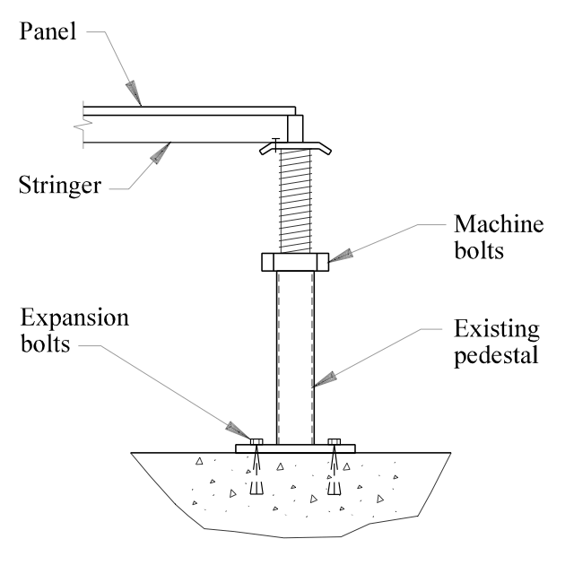 - 페데스탈 위치 배치 및 고정 – 600×600 또는 500×500 모듈 – 콘크리트에 기계식 앵커(M10~M12)로 체결