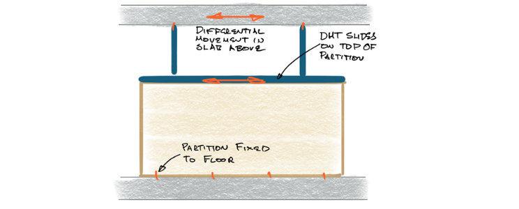 층간 변위에 대응하기 위해 **변위 헤드(DHT, Deflection Head Track)**를 사용합니다. 이는 벽 스터드가 트랙 내부에서 수직/수평으로 미끄러질 수 있게 하여 주 벽체에 과도한 응력이 집중되는 것을 방지합니다.