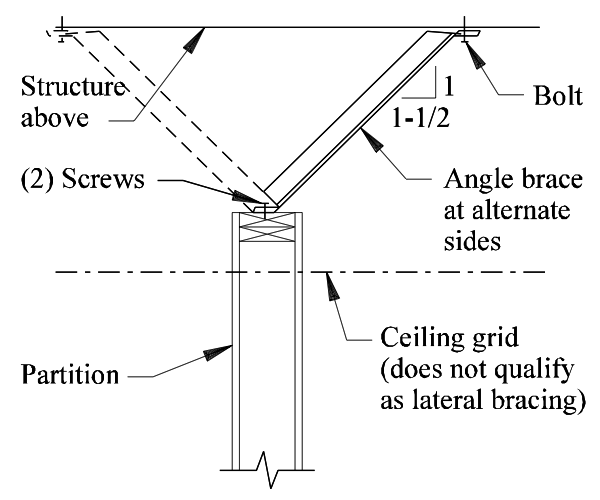 - 앵글 브레이스 배치: 약 2.4m 간격으로 설치하며, 각 칸막이마다 최소 두 개의 브레이스를 양방향으로 번갈아 설치합니다.