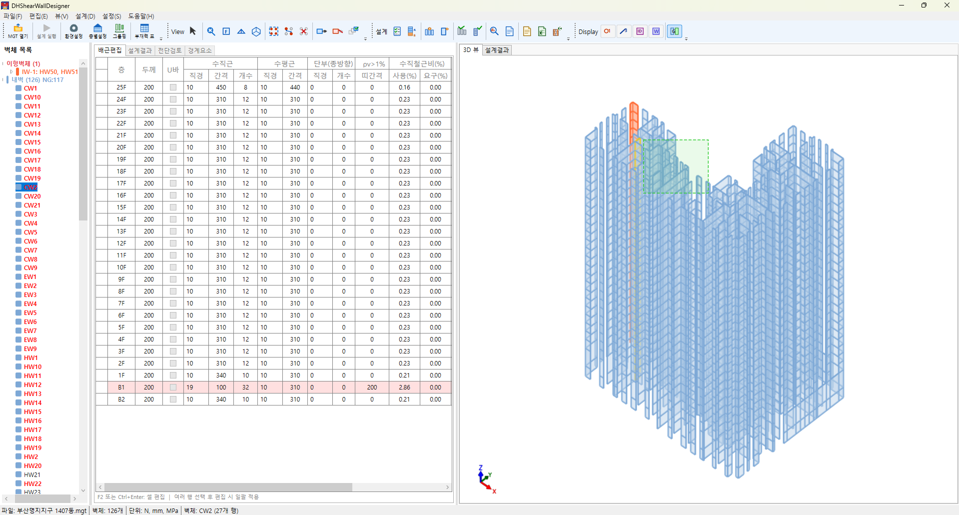 좌측 트리에서 WallMark 를 선택하면 우측에 부재력·배근·DC 가 표시되는 DataGrid 가 나타나고, 3D 뷰포트에 전체 건물의 벽체 모델이 표시된다.