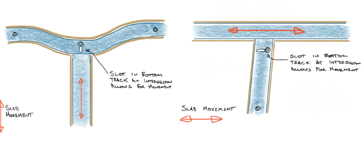 - 바닥 트랙 슬롯: 바닥 트랙에 슬롯을 절단하여 인접 벽체와 함께 유동적으로 움직일 수 있도록 유도합니다.