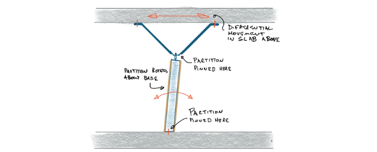경량 칸막이 벽체는 건물의 횡변위(층간 변위) 발생 시 구조물과 함께 거동하며 손상될 위험이 큽니다. 특히 천장까지 확장되는 칸막이의 경우, 상부 구조물과의 적절한 이격과 브레이싱을 통해 내진 성능을 확보하는 것이 중요합니다.